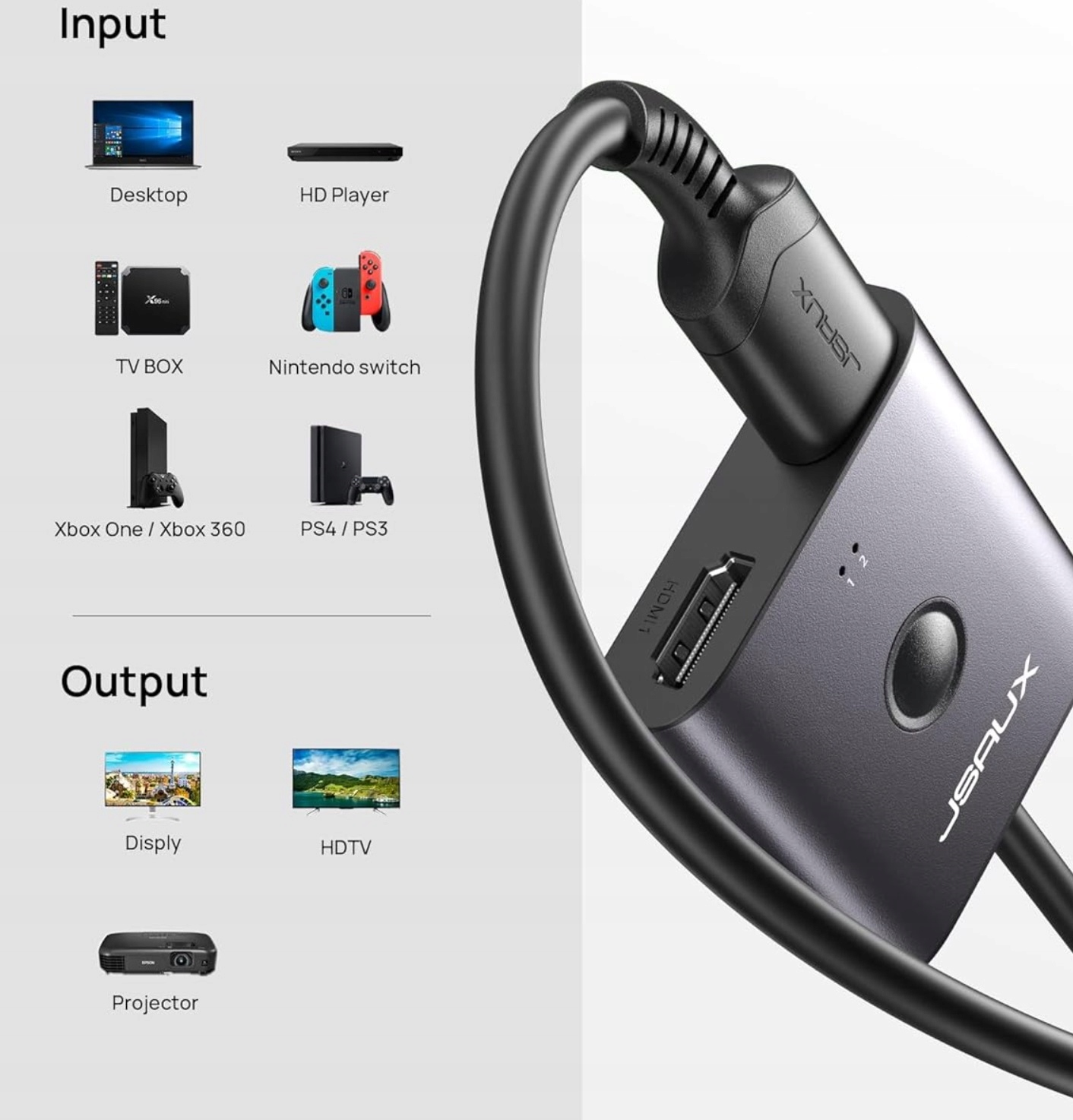 ⭐ Двунаправленный переключатель JSAUX Plug&Play позволяет легко переключаться между двумя мониторами. Одновременно может отображаться один монитор.