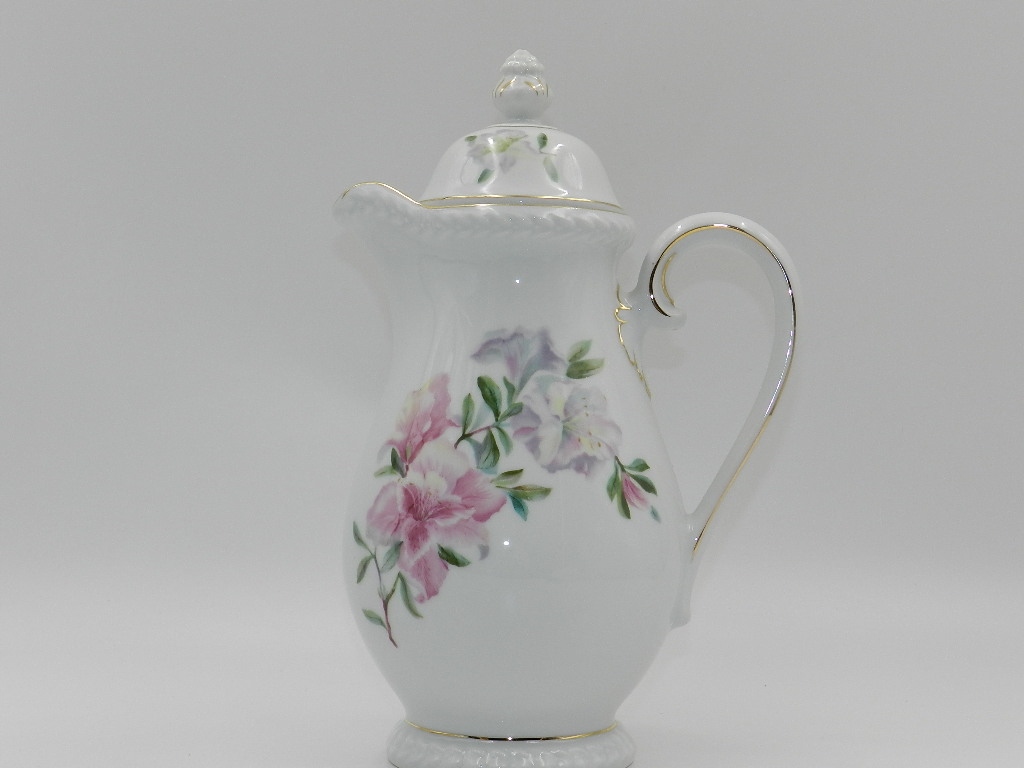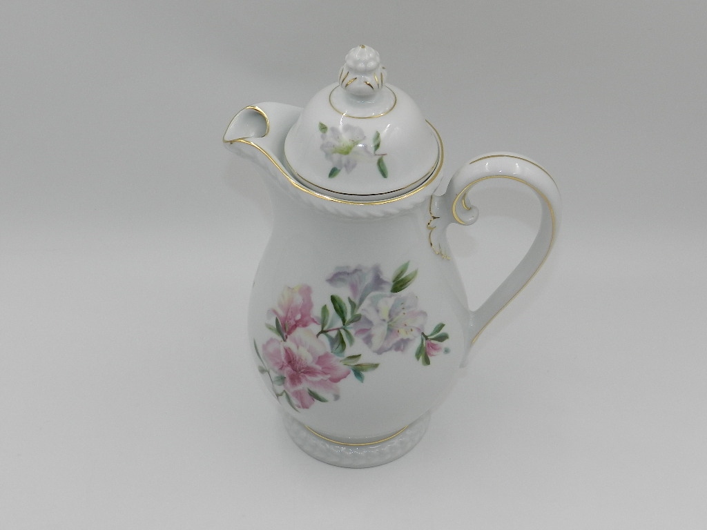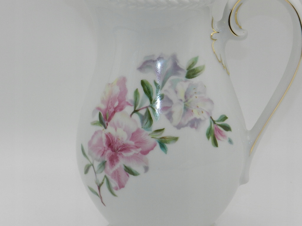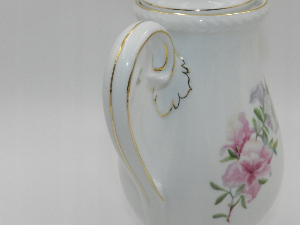 Белый фарфор чрезвычайно гармоничной формы с чудесным мотивом ветки фиолетовых и розовых цветов спереди и сзади кувшина. Дополнительно на обложке повторяется цветочный мотив. Все отделано тонкой золотой позолотой. Все это дополняет красиво смоделированная вершина и толстый рельеф вокруг литника и основания.