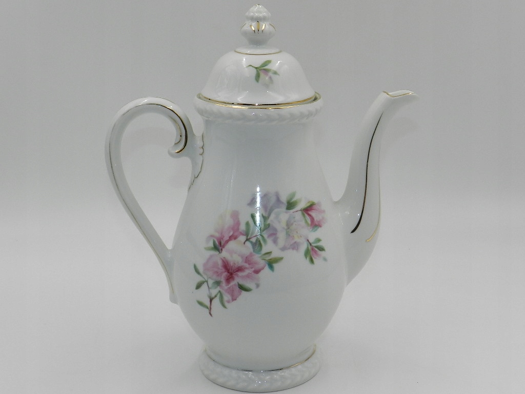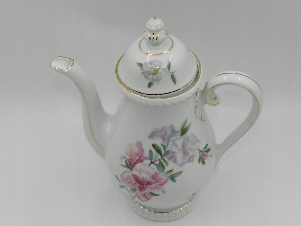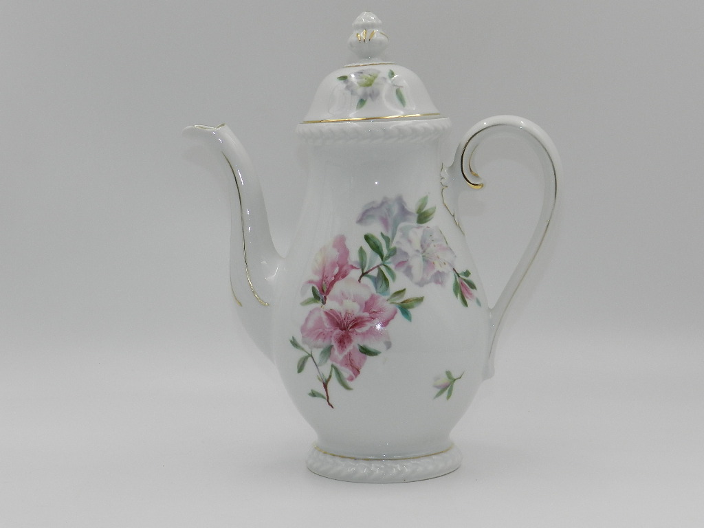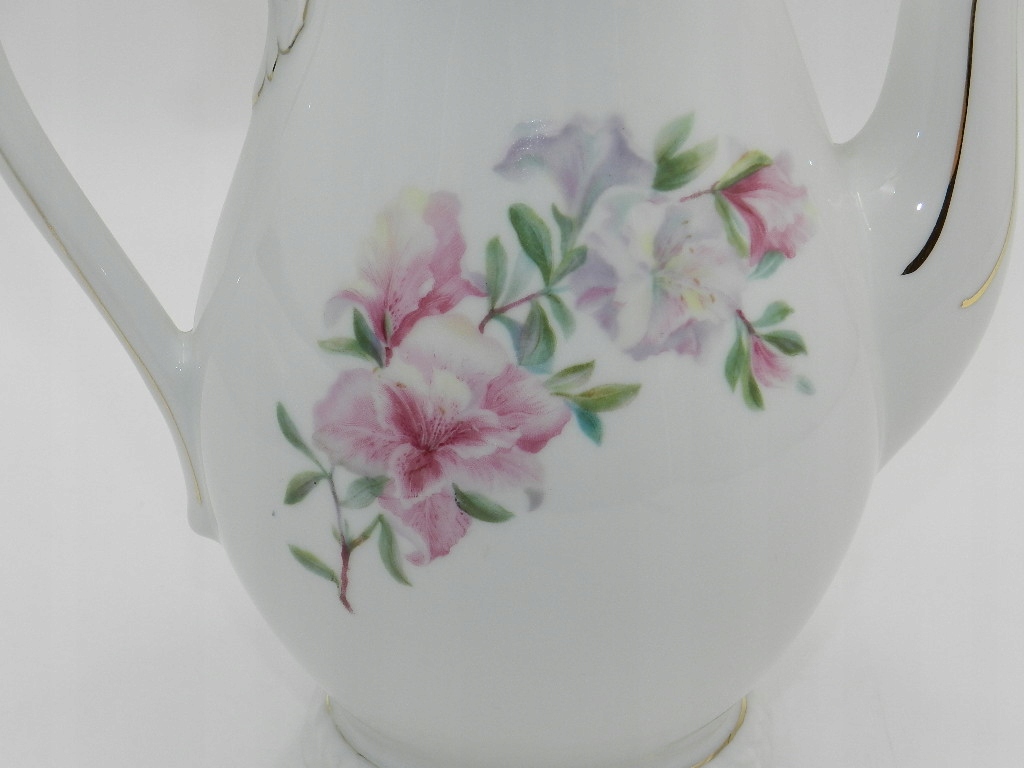 Белый фарфор чрезвычайно гармоничной формы с чудесным мотивом ветки фиолетовых и розовых цветов спереди и сзади кувшина. Дополнительно на обложке повторяется цветочный мотив. Все отделано тонкой золотой позолотой. Все это дополняет красиво смоделированная вершина и толстый рельеф вокруг литника и основания.