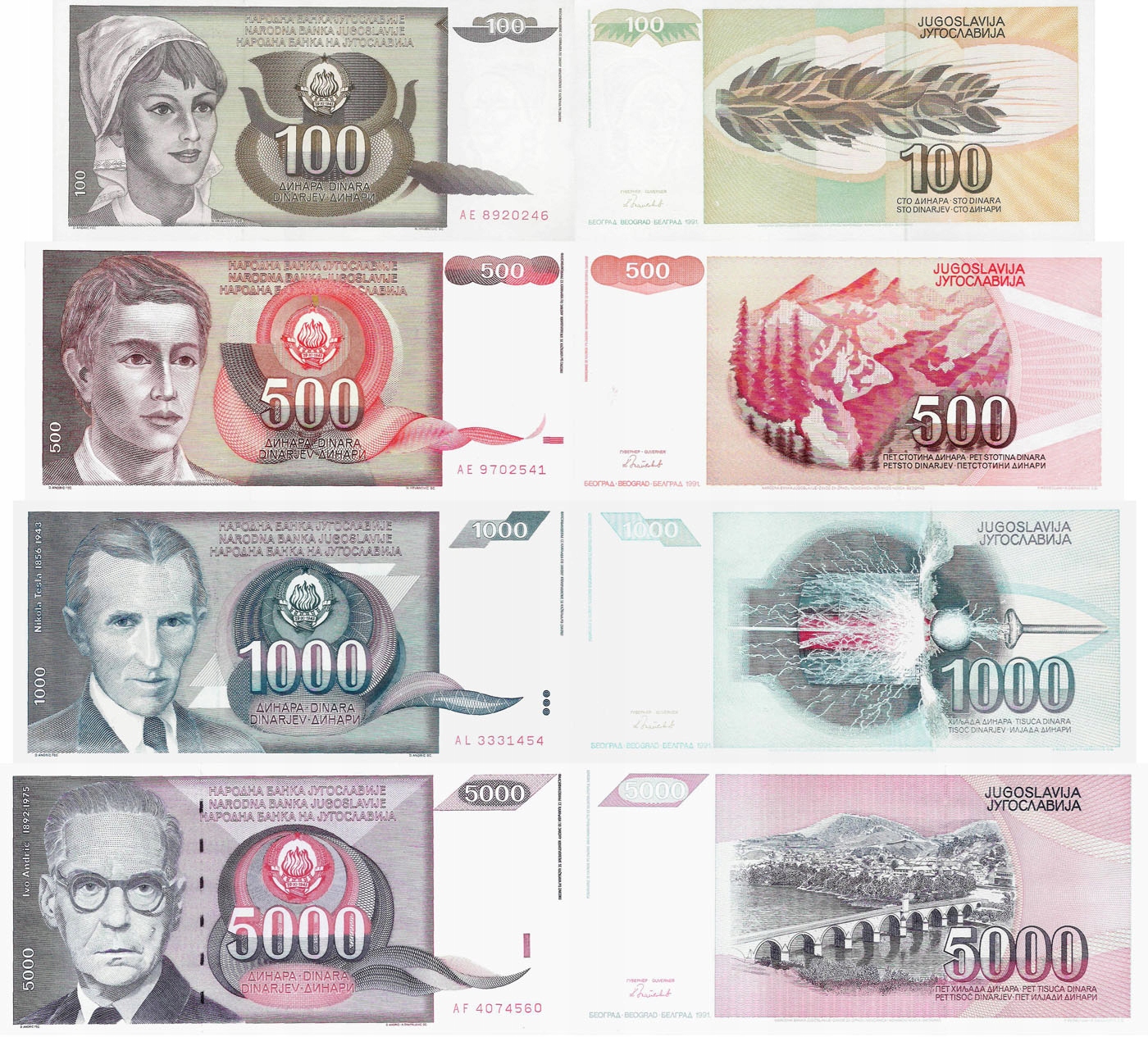 Jugosławia 1991 - zestaw 4 szt 100+500+1000+5000 Dinars Pick 108-111 UNC