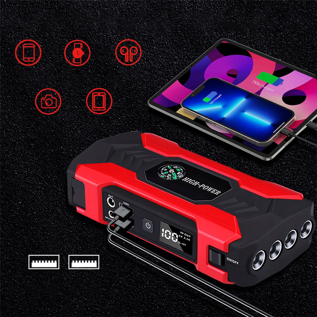 🔋Он может заряжать устройства быстрее через USB-выходы 3-в-1 (5 В–2,1 А/19 В/16 В/12 В) и совместим практически со всеми зарядными устройствами USB, включая мобильные телефоны, планшеты, цифровые камеры и другие электронные устройства.