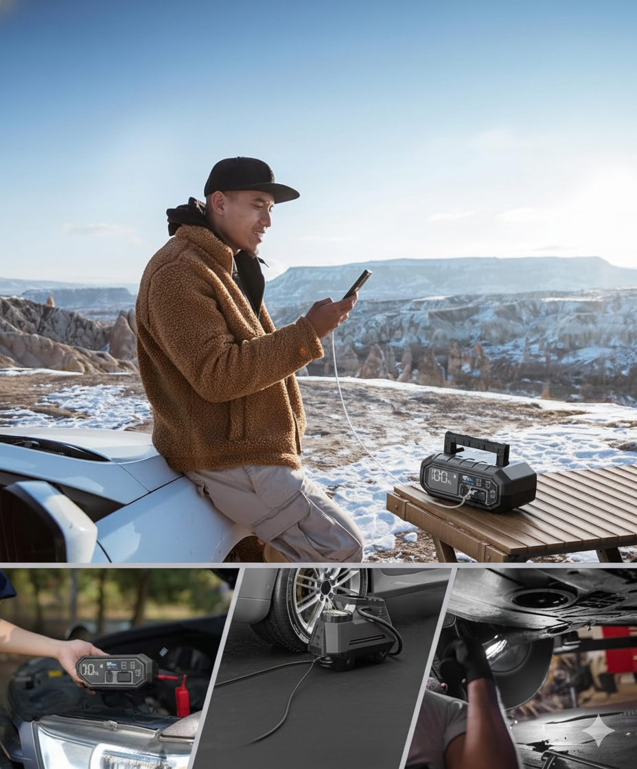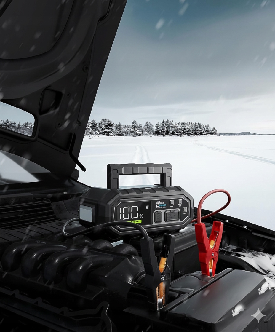 - Полный комплект «Все в одном» — соединительные кабели, кабель USB-C, адаптер для прикуривателя и прочный чехол; работает при температуре от -20°С до 60°С.
