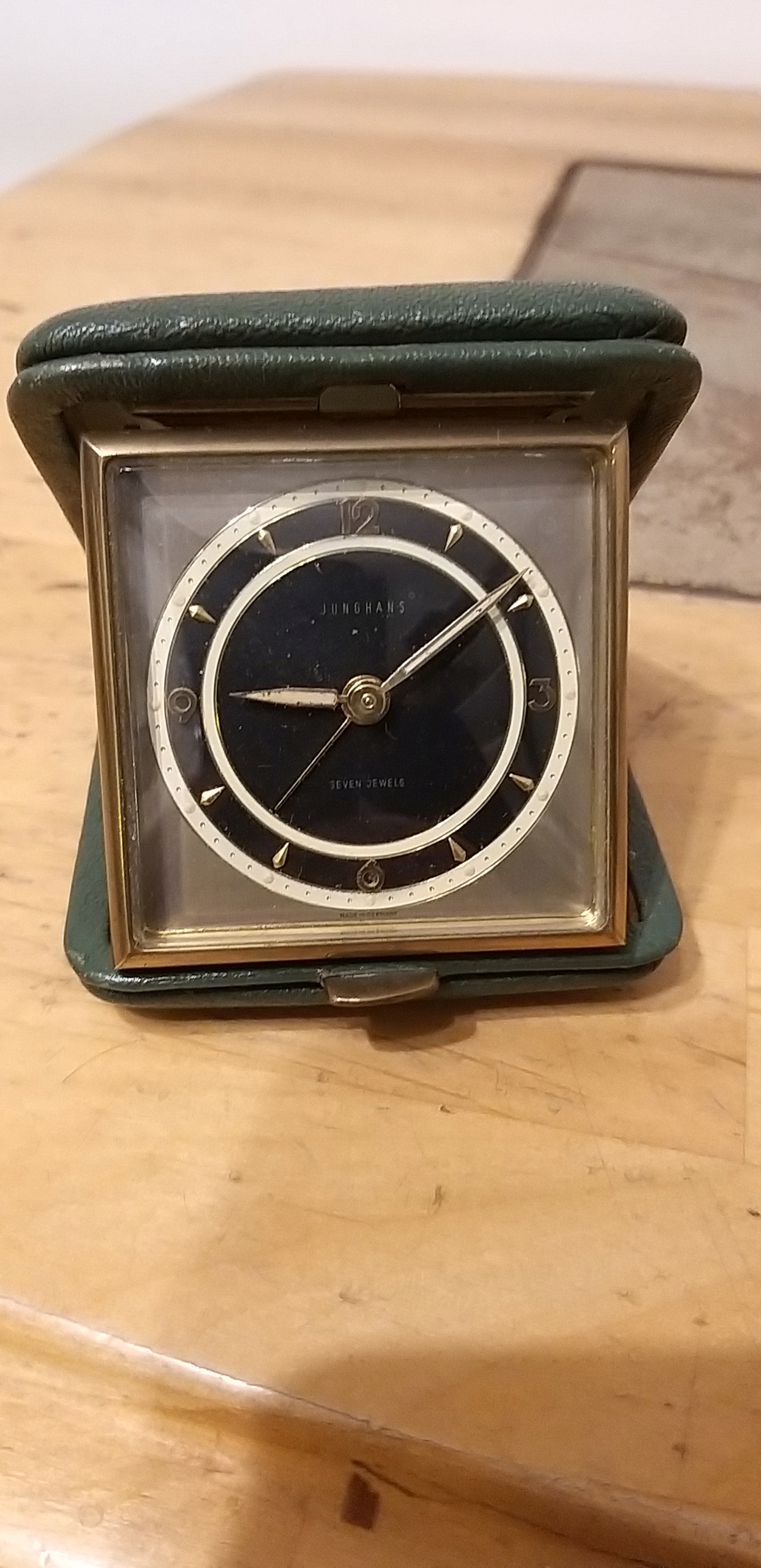 Дорожный будильник Junghans в рабочем состоянии. Подзавод, смена стрелок и будильник работают исправно. Будильник можно вынуть из чехла и поставить отдельно. Товар имеет следы использования. Продаю товар, представленный на фото.