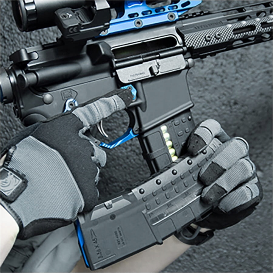Специальный ограничитель, расположенный чуть выше затыльника приклада, облегчает извлечение и предотвращает слишком глубокое вставление магазина в подсумок. Кроме того, нескользящие ножи на стенах облегчают манипулирование магазином. Благодаря отверстиям в ножке к магазину можно прикрепить импровизированные ручки из паракорда, что позволит более эффективно и быстро вытаскивать его из подсумка.