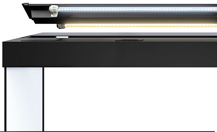 Комплект оснащен балкой Светодиодное освещение Multilux с двумя сменными светодиодными лампами Nature и День, каждый мощностью 21 Вт, обеспечивающий специально подобранный спектр фонари для обычных танков и вдвое меньшее потребление электроэнергии по сравнению с Люминесцентные лампы Т5. Водонепроницаемость балок позволяет работать в резервуаре. проходить при включенном свете без риска повреждения освещение из-за случайных брызг.