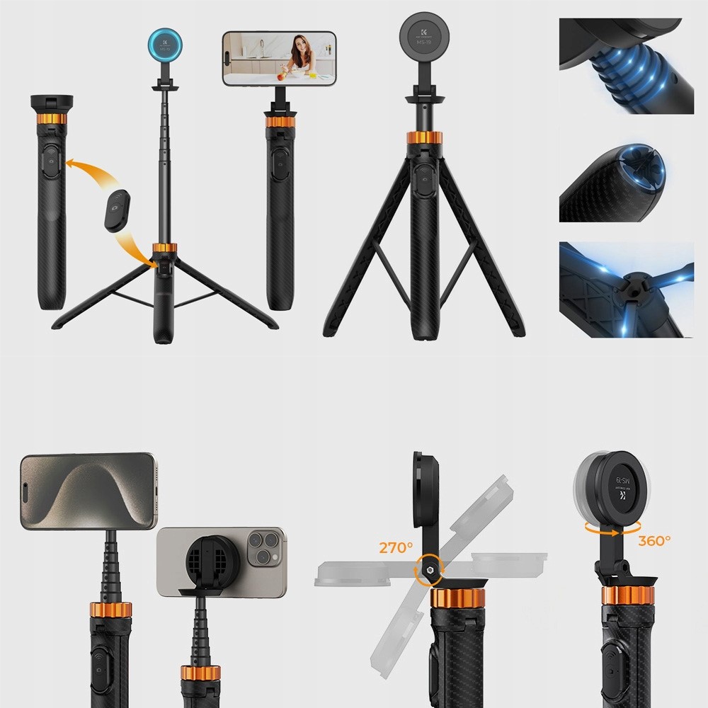 k & f Концепция Selfie MS19 Штатив является идеальным решением для всех, кто ценит универсальность и функциональность. Благодаря выдвинутую центральную колонку, которая предлагает рабочую высоту в диапазоне от 45 до 159 см, вы можете легко установить устройство в оптимальном положении для фотографий или видеозаписей. Независимо от того, планируете ли вы запечатлеть величественные пейзажи, динамические спортивные рамки или просто идеальное селфи, этот штатив предоставит вам полную свободу действий. Неограниченные варианты фотографии. Вы будете использовать его не только в качестве традиционного штатива, но и монопод или селфи. Vlog, Вебинар, онлайн -уроки, видео о зарослях, праздничных записей, кулинарное видео, путешествия или спорт - этот компактный дизайн является бесценной поддержкой в любой ситуации. Значительно улучшает удобство повседневного использования. Благодаря сильному магниту установка телефона на штатив становится простым и быстрым. Один прикосновение достаточно, чтобы устройство уверенно подключилось к головой штатива. Это особенно полезно в ситуациях, когда каждая секунда имеет значение, и вы хотите начать запись или сфотографироваться немедленно. Независимо от того, какой смартфон вы используете, вы всегда можете быть уверены, что ваше оборудование будет безопасно установлено. Формы