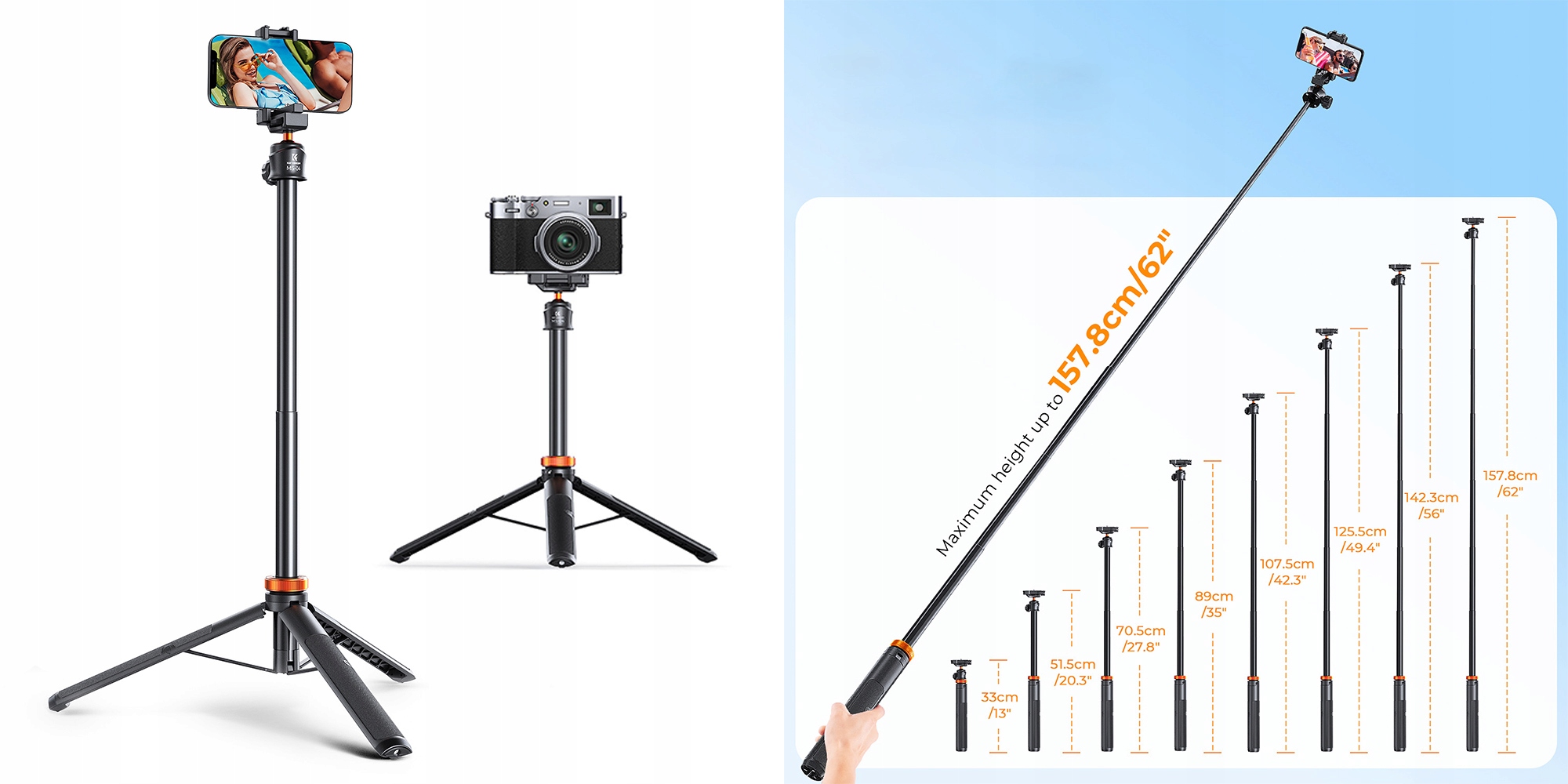 Убедитесь, что ваше профессиональное качество фотографий и неограниченное количество вариантов фотографии благодаря концепции K & F Concept Selfie Photo Photo с помощью телефона. Благодаря максимальной высоте, достигающей 157,8 см и 7-последовательной конструкции, вы можете адаптировать ее к различным потребностям в течение нескольких секунд. Вы будете использовать его не только в качестве традиционного штатива, но и монопод или селфи. Объект, вебинар, онлайн -уроки, видео по чаще, праздничные записи, кулинарное видео, путешествия или спорт - этот компактный штатив является бесценной поддержкой в любой ситуации. Голова штатива успешно выдержит загрузку до 2 кг, предоставляя вам комфорт работы со смартфоном, камерой или спортивной камерой.