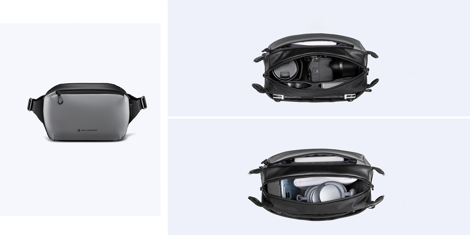 Фотосумка K&F Concept Alpha Sling Bag объемом 10 л имеет съемное отделение. Аксессуар из твердых материалов облегчит организацию пространства. С ее помощью вы сможете разделить внутреннюю часть сумки на 2 или 3 части, в зависимости от имеющегося у вас с собой снаряжения. Отделение также дополнительно укрепляет сумку и обеспечивает еще лучшую защиту переносимых устройств. Вот пример того, что может вместить слинг-сумка K&F Concept Alpha объемом 10 л: