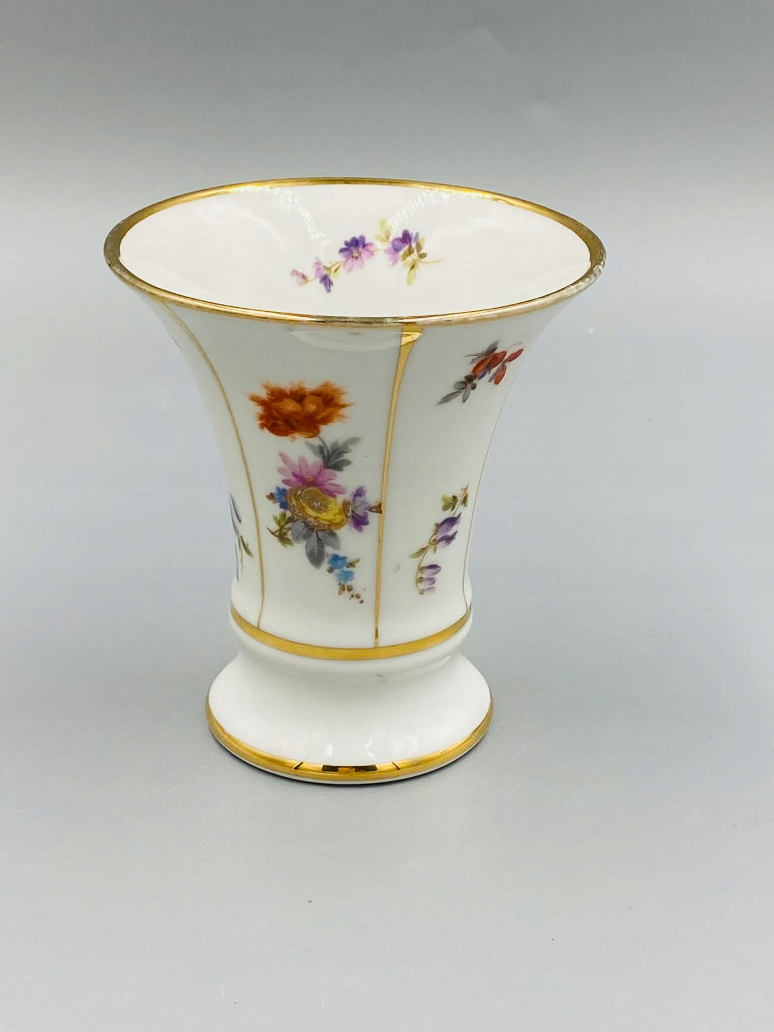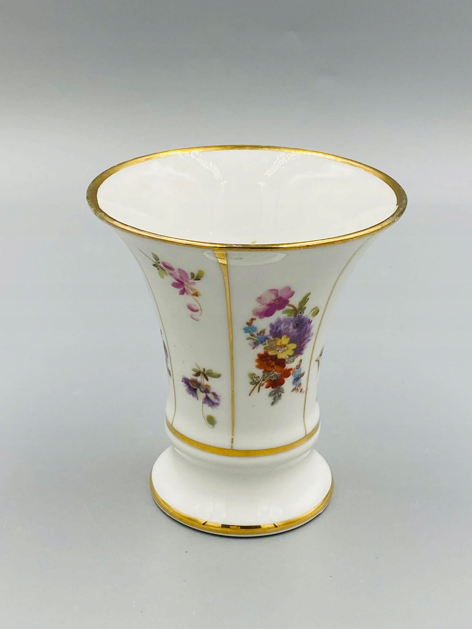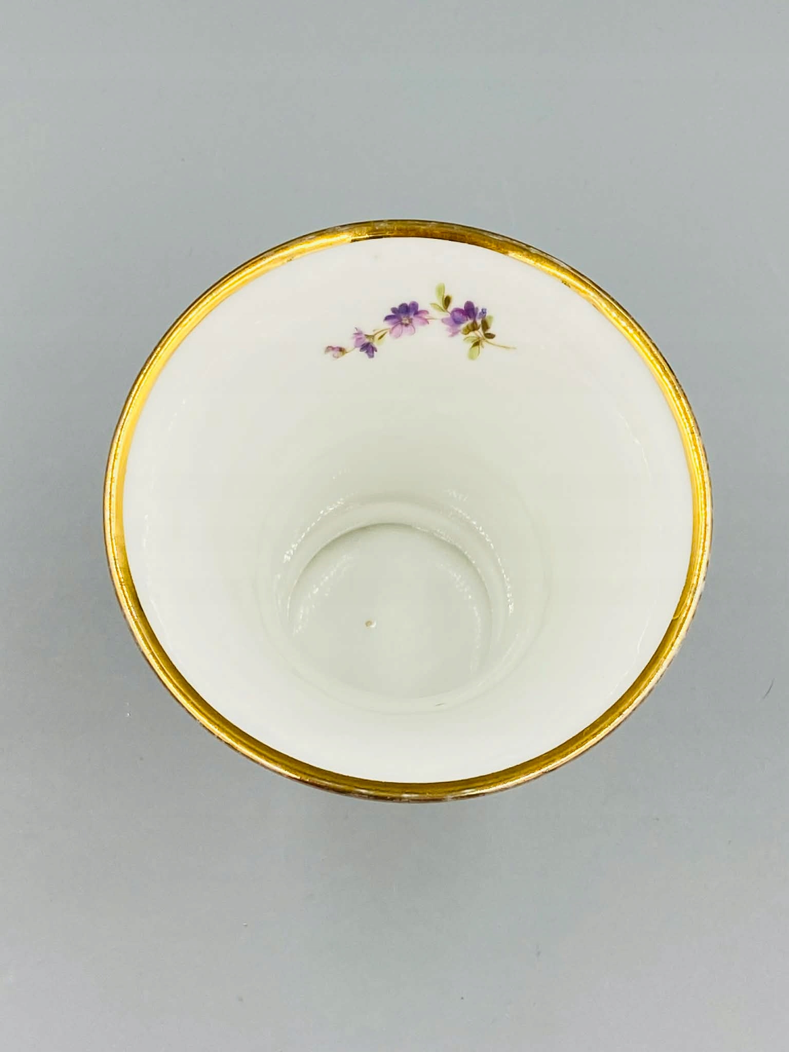 Белый фарфор, украшенный мелкими цветами и золотыми полосками. Края позолочены.