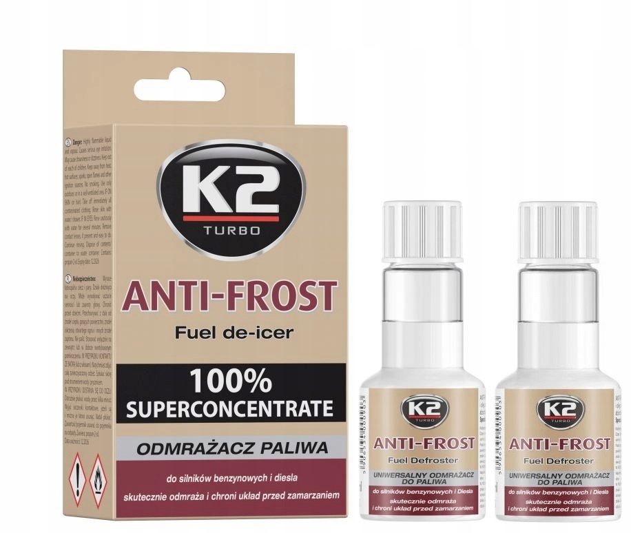Универсальный антиобледенитель топлива К2 АНТИ-МОРОЗ. Подходит как для бензина, так и для дизеля. Эффективно размораживает всю систему электропитания и надолго связывает конденсат, защищая систему от замерзания.