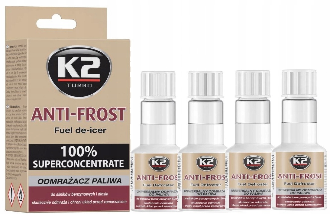 К2 АНТИ-МОРОЗ универсальный антиобледенитель топлива. Подходит как для бензина, так и для дизеля. Эффективно размораживает всю систему электропитания и надолго связывает конденсат, защищая систему от замерзания.