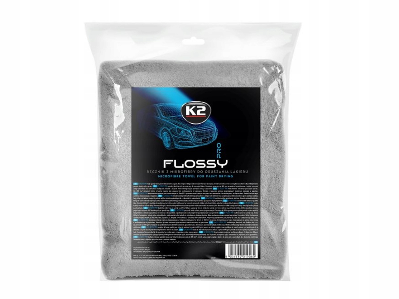 Полотенце из микрофибры K2 Flossy PRO — самое эффективное и большое полотенце для сушки краски в предложении K2. Несомненно, гигант в категории полотенец для сушки автомобиля с плотностью 800 г/м2 (грамм на квадратный метр). Мечта каждого любителя чистого и ухоженного автомобиля.