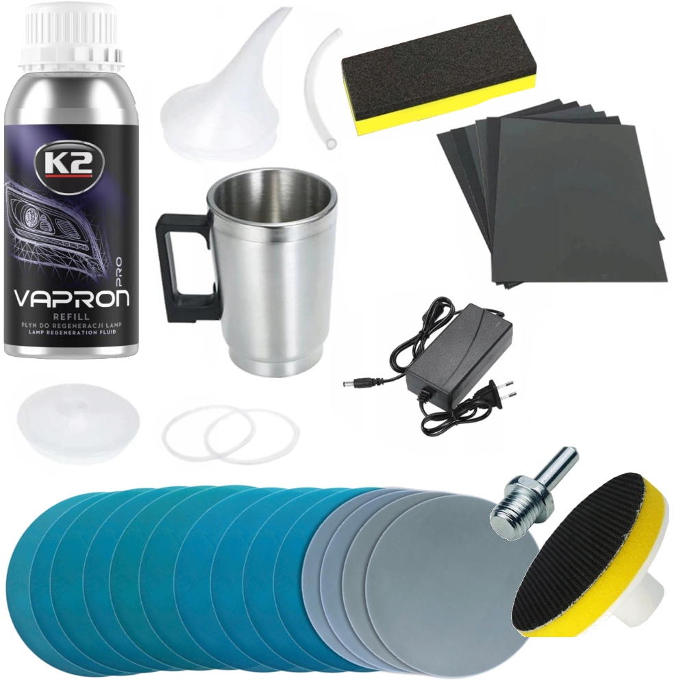 Набор K2 Vapron удаляет все царапины, изменения цвета и тусклость. Жидкий поликарбонат нагревают в специальном «чайнике» (чашке), а затем его пары наносятся на поврежденную поверхность, оседая и восстанавливая ее. Регенерированные таким способом лампы обретают первоначальный, заводской, привлекательный вид.
