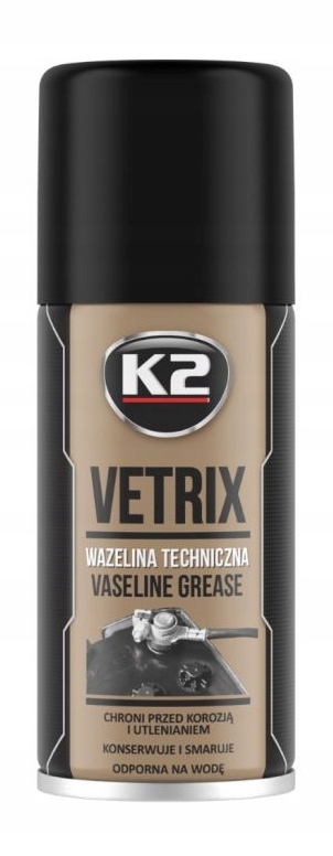 K2 VETRIX - Защищает металлические поверхности от коррозии, консервирует и смазывает пластиковые и резиновые элементы. Защищает клеммы аккумулятора от окисления. Устойчив к воде, соли, слабым кислотам и основаниям. Оптимальная смазка достигается после испарения растворителя.