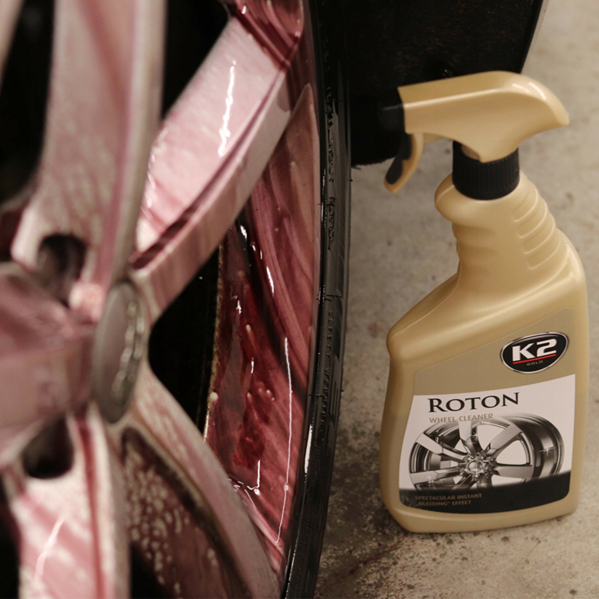 K2 ROTON эффективно удаляет всю стойкую грязь, включая отложения на тормозных колодках и дорожную грязь, в результате чего наносимая жидкость приобретает красный цвет.