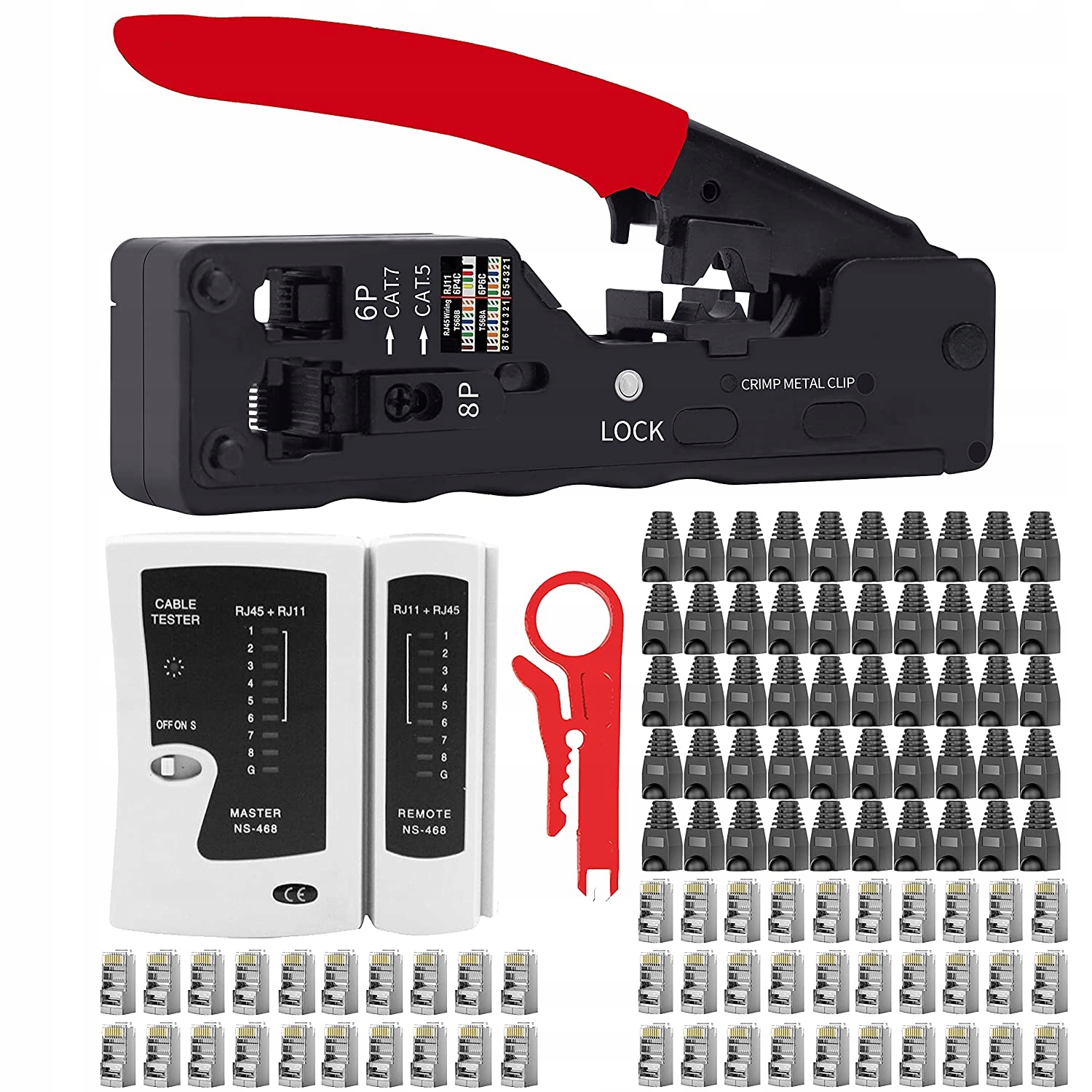 - В комплект входят все необходимые аксессуары, такие как 30 шт. модульных вилок для передачи данных RJ45 Cat5, CAT5E/CAT6, 30 шт. гильз, 100 шт. 6-дюймовых нейлоновых кабельных стяжек и сетевой инструмент для зачистки проводов. Этот универсальный комплект включает в себя все необходимое для фиксации, фиксации и организации вещей. Щипцы