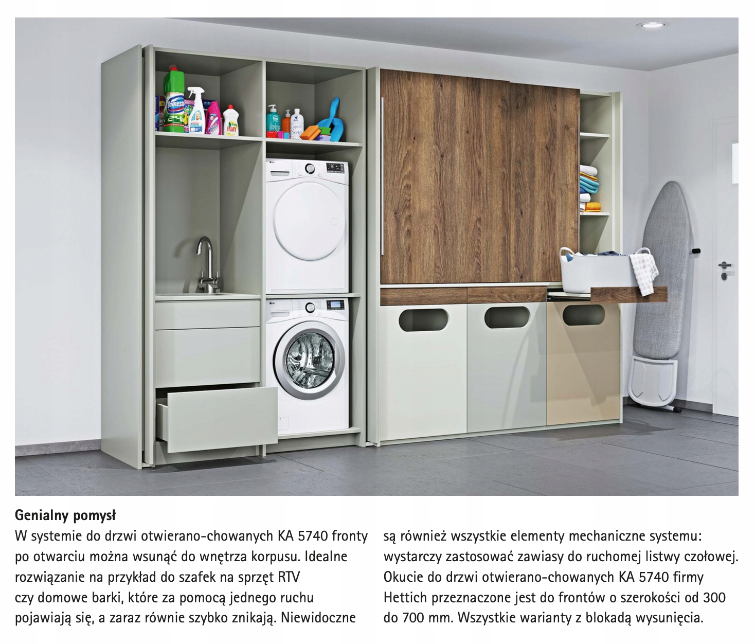 В системе раздвижных дверей KA 5740 фасады можно сдвинуть в внутреннюю часть тела. Идеальное решение, например, для тумб под телевизор или домашних баров, которые появляются одним движением и так же быстро исчезают. Все механические элементы системы также невидимы: достаточно использовать петли для подвижной передней планки. Фурнитура для раздвижных дверей KA 5740 от Hettich предназначена для фасадов шириной от 300 до 700 мм. Все варианты с удлинителем.