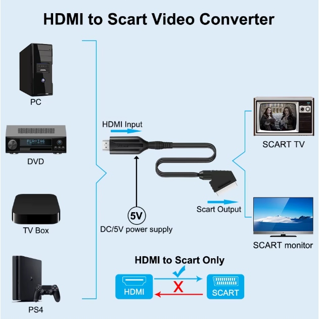кабель/преобразователь HDMI для Scart с разрешением 720p/1080p, переключатель PAL/NTSC на корпусе и источнике питания через кабель MicroUSB Microusb 80 см, длина 90 сантиметров. Практическое решение для подключения современных устройств HDMI (таких как декодеры, игроки Blu-ray, игровые приставки) к более старым телевизорам, оснащенным разъемом Scart (Euro). Благодаря этому вы можете насладиться цифровым изображением и звуком на аналоговых приемниках.