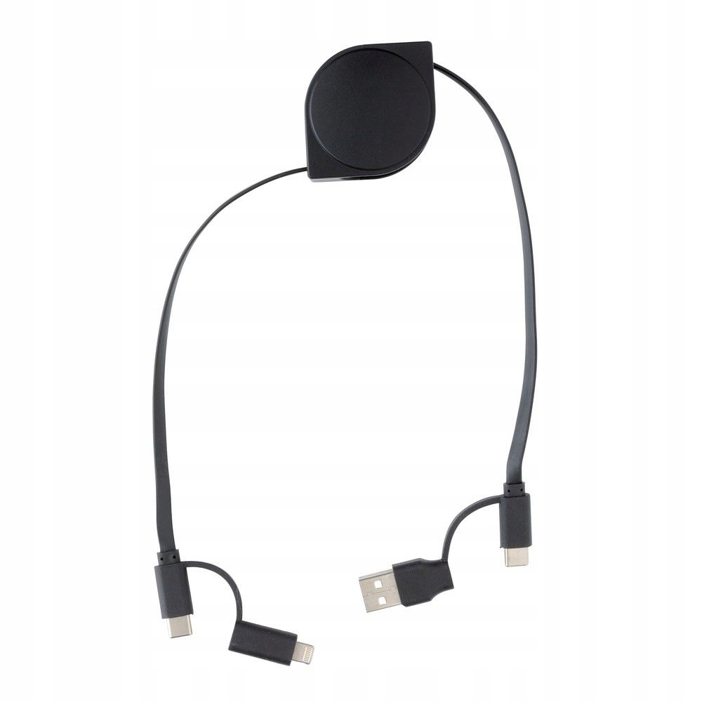 Выдвижной зарядный кабель с 5 разъемами: USB, 2 x Type C и 2 в 1 (micro USB и совместимость с устройствами iOS), корпус из переработанного АБС-пластика, сертифицирован RCS (Recycled Claim Standard), который используется, когда изделие частично или полностью изготовлено из переработанных материалов, не содержит ПВХ