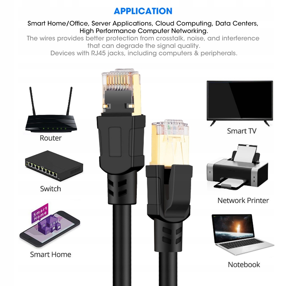 1. Кабели обеспечивают лучшую защиту от перекрестных помех, шума и помех, которые могут ухудшить качество сигнала, а скорость сети более стабильна. 2, Ethernet-кабель Cat 8 обратно совместим со стандартами кабелей Cat5, Cat5e, Cat6, Cat6a, Cat6e, Cat7, Cat7a. 3. Устройства с разъемами RJ45, в том числе компьютеры и компьютеры. периферийные устройства, такие как маршрутизаторы, коммутаторы, Playstation, Poe, концентраторы, модемы, патч-панели, сетевые карты, сетевые принтеры и подключенные к сети устройства хранения данных и т. д. 4. Максимальная длина канала кабеля Cat8 составляет 30 м (100 футов). 5. По сравнению с другими Ethernet-кабелями 32AWG, кабель 26AWG толще, быстрее и стабильнее. 6, подходит для умного дома/офиса, серверных приложений, облачных вычислений, центров обработки данных, высокопроизводительных компьютерных сетей.