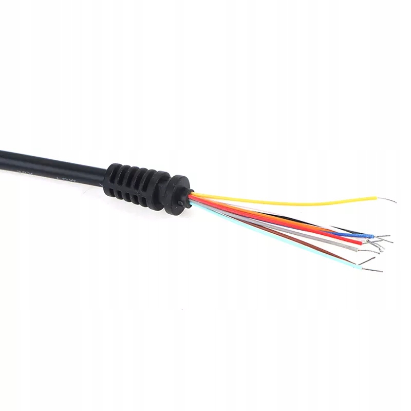 На одном конце 9-контактный штекер, на другом конце компенсатор натяжения и 9 проводов для припайки к площадке.