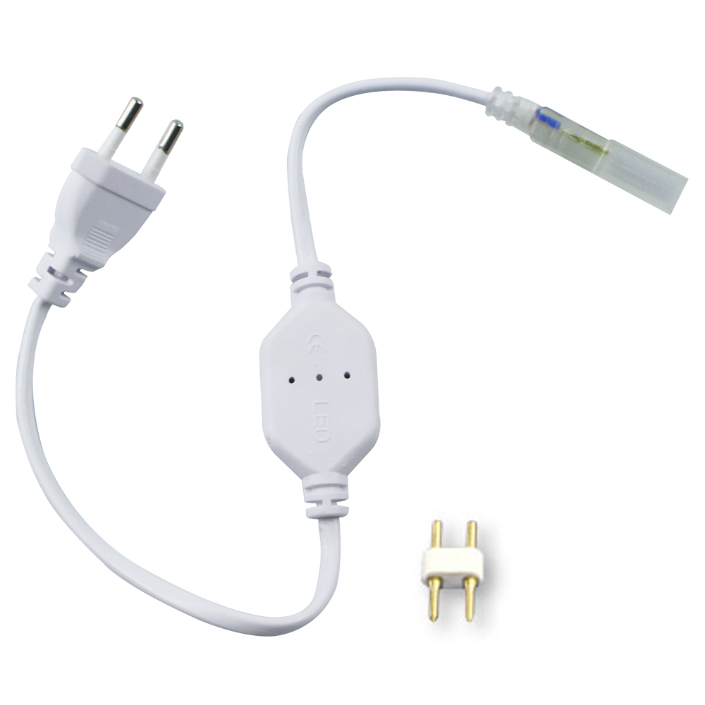 Сетевой кабель необходим для правильного питания светодиодной ленты 230В — благодаря встроенному выпрямителю он исключает эффект пульсации света. В комплект входит разъем и наконечник светодиодной ленты.