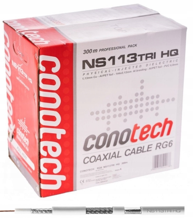 Высококачественный коаксиальный кабель типа RG6 с тройным экраном, с внутренней жилой из медной проволоки > диаметром 1,13 мм. Проводник покрыт полиэтиленом, физически вспененным азотом (N), который имеет особо эффективную диэлектрическую изоляцию. Экранирование кабеля выполнено в соответствии со стандартом Trishield, в котором используется тройная защита жил, состоящая из слоя алюминиевой фольги AL/PET, алюминиевой оплетки с коэффициентом покрытия до 98% и еще один слой алюминиевой фольги AL/PET.