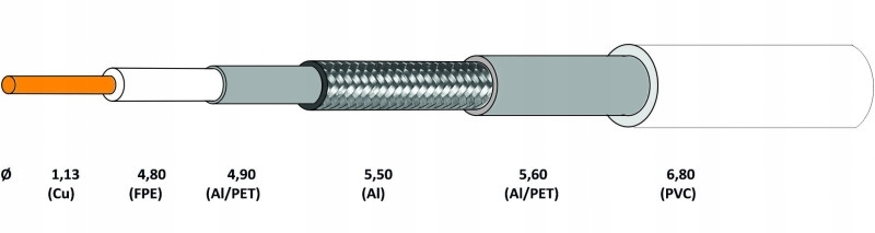 - Внутренний проводник: медь Ø 1,13 мм Cu ± 0,02 мм.