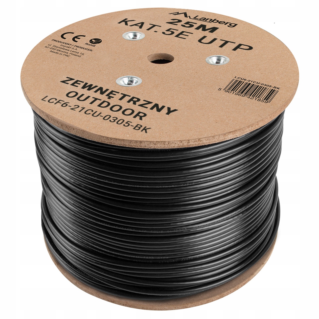 КАБЕЛЬ ЛВС UTP CAT.5E, 25 М, НАРУЖНЫЙ ПРОВОД CU, ЧЕРНЫЙ, ПРОЙДЕН LANBERG