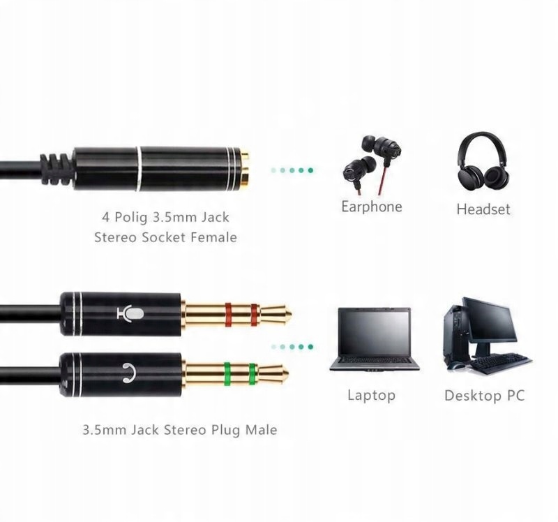 Высококачественный кабель, позволяющий подключить гарнитуру к компьютеру через стереоразъем 3,5 мм. Просто подключите разъемы гарнитуры в соответствии с цветами гнездовых портов кабеля.