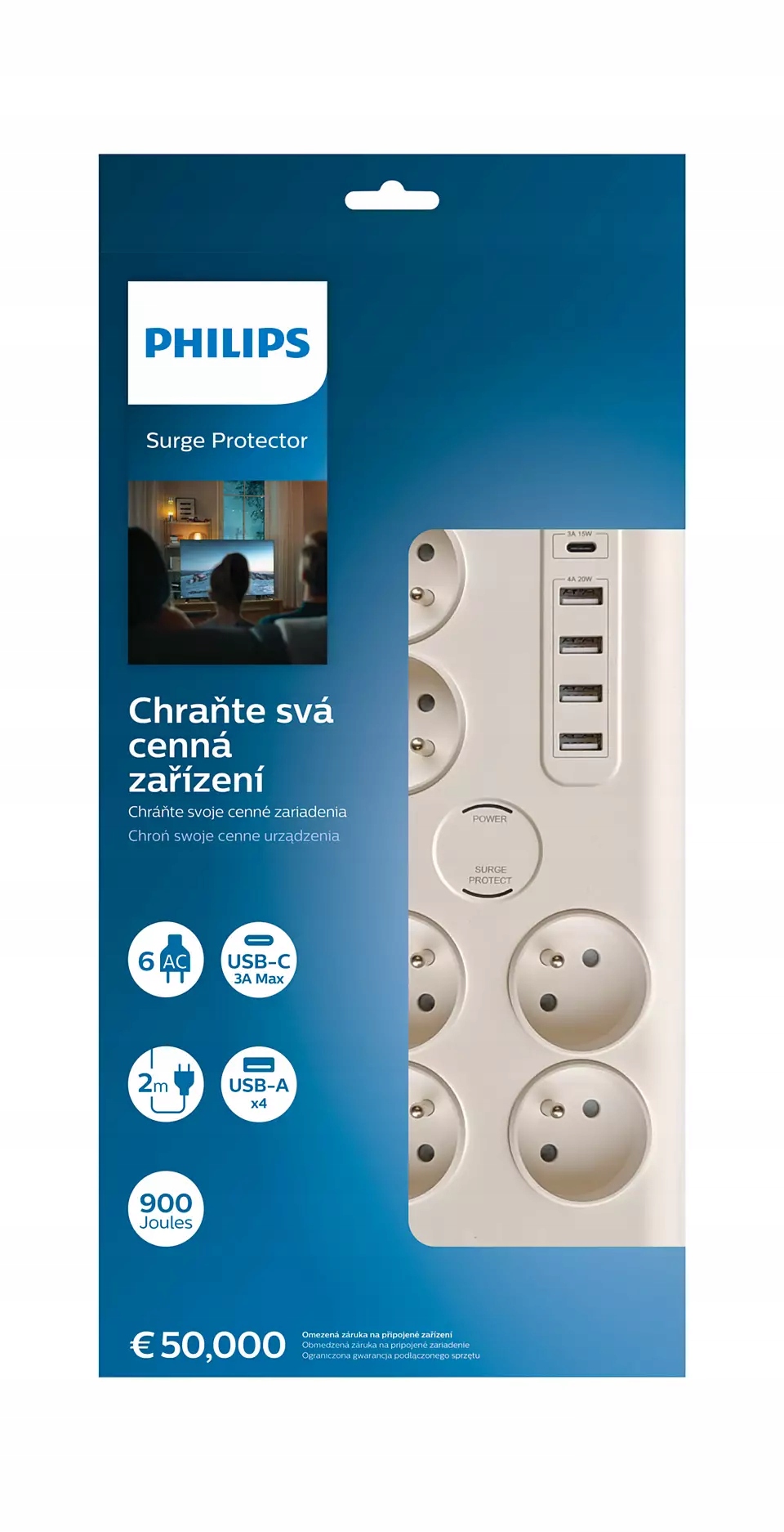 Удлинитель PHILIPS оснащен защитой от перенапряжений, шестью стандартными розетками с заземлением, 4 портами USB-A, 1 разъемом USB-C, 2-метровым кабелем и удобным выключателем.