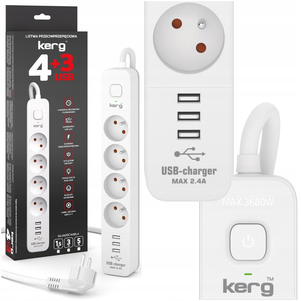 Удлинитель Kerg для защиты от перенапряжения с выключателем 1,5м 16А ➡️ 4 розетки с заземлением + 3x USB ⬅️