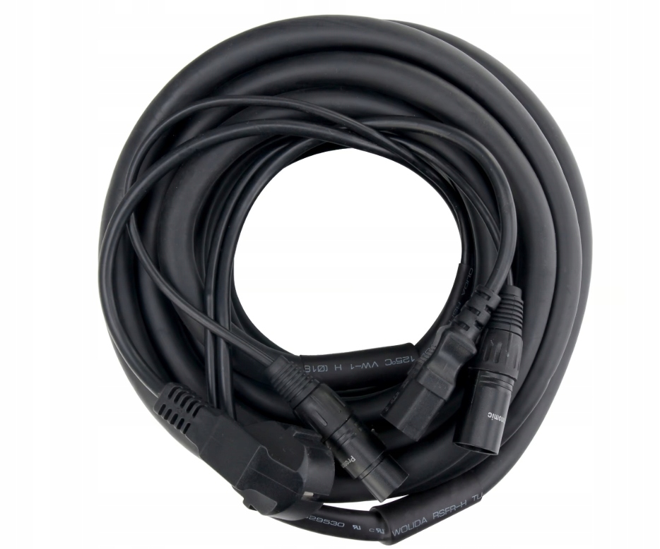 Комбинированный кабель Pronomic для активных колонок сочетает в себе мощность и мощность сигнала в одном кабеле. Это позволяет избежать множества раздражающих запутанных кабелей. Кабель оснащен 3-контактными разъемами XLR (папа/гнездо), а также разъемами с заземленными контактами и разъемом IEC/IEC (гнездо) для питания.