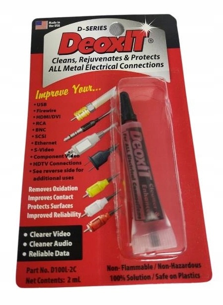 Примечание. Мы всегда рекомендуем проверять совместимость DeoxIT и продукта с покрытием. Материалы, используемые в разных кабелях, могут реагировать по-разному. Мы не знаем состав разъемов. Уборку вы выполняете на свой страх и риск и самостоятельно.