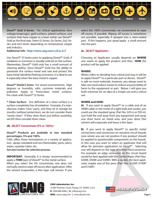 После очистки поверхности для дополнительной защиты можно нанести DeoxIT® Gold G-Series (внутреннее применение) или DeoxIT® Shield S-Series (сложные условия: вода, соль, загрязнение и т. д.).