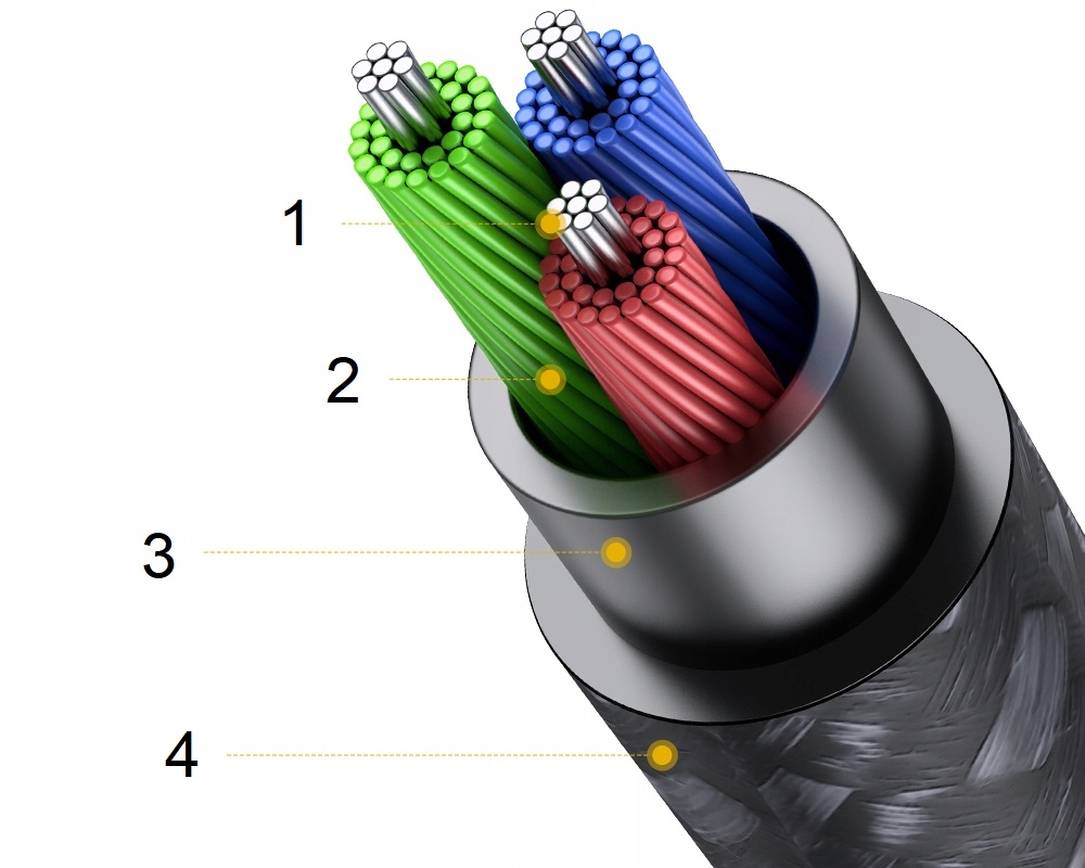 Все это покрыто гибкой и полностью экранированной оболочкой из прочного ТПЭ, дополнительно защищенной нейлоновой оплеткой.