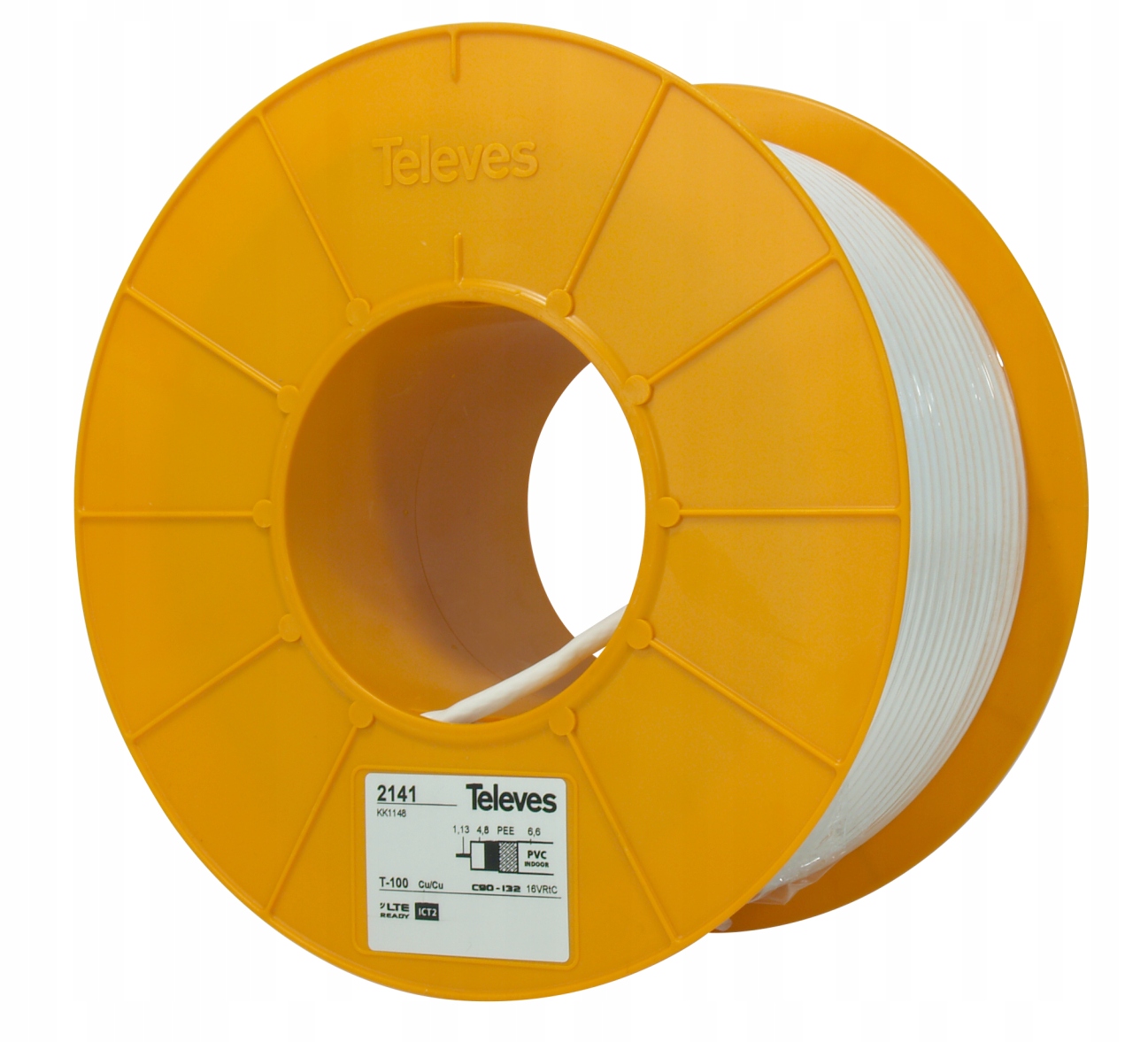 Высококлассный белый цельномедный коаксиальный кабель от испанского бренда Televes с маркировкой T100 (кат. номер 2141), используемый для наземных и спутниковых систем приема. Антенный кабель такого качества идеален для установки антенн для передачи каналов HDTV.
