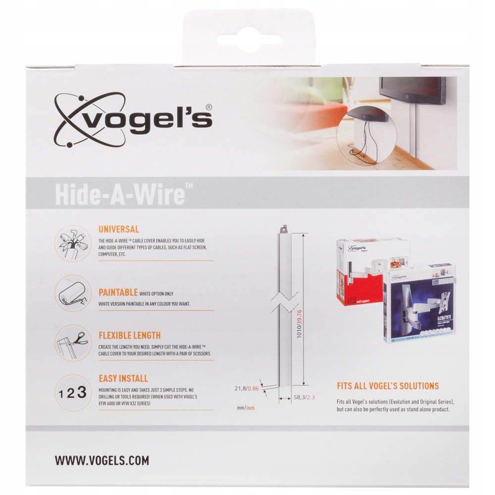 Vogel's представляет уникальную систему Hide-A-Wire, которая позволит вам тщательно спрятать телевизионные кабели. Элегантная форма и универсальный цвет (белая полоска, подходящая под покраску) позволят подобрать ее к любому интерьеру. Для сборки не требуются инструменты. Его можно отрезать на любую длину. Длина 1010 мм.