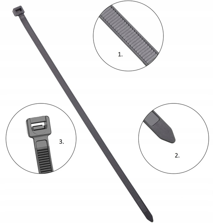 Самоблокирующийся замок ремешка прочный и долговечный. По всей длине ремешка имеются зубцы, позволяющие точно настроить размер петли в соответствии с вашими индивидуальными потребностями. Кабельные стяжки очень гибкие и устойчивы к высоким температурам.