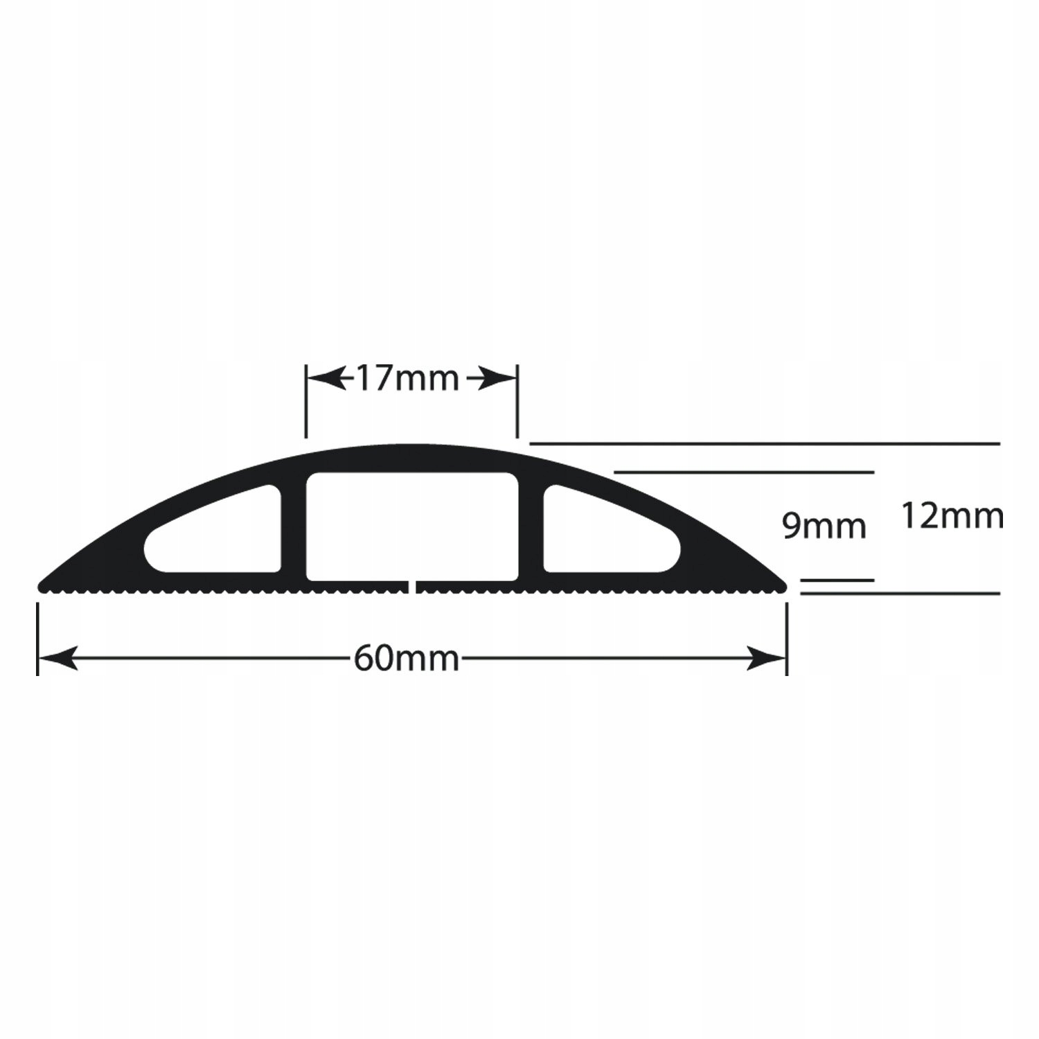 - Размеры напольной крышки кабеля D-Line: 9 м (Д) x 60 мм (Ш) x 12 мм (В), внутренний отсек = 17 мм (Ш) x 9 мм (В). )