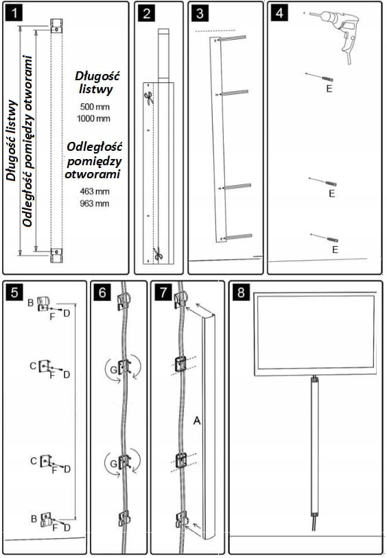В комплект входят монтажные шпильки и винты, 4 зажима для крепления планки, хомуты для крепления кабелей, шаблон для разметки отверстий и инструкция по сборке.