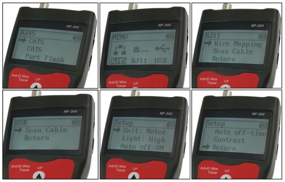 - разнообразие тестируемых кабелей: RJ11, RJ45, BNC, USB