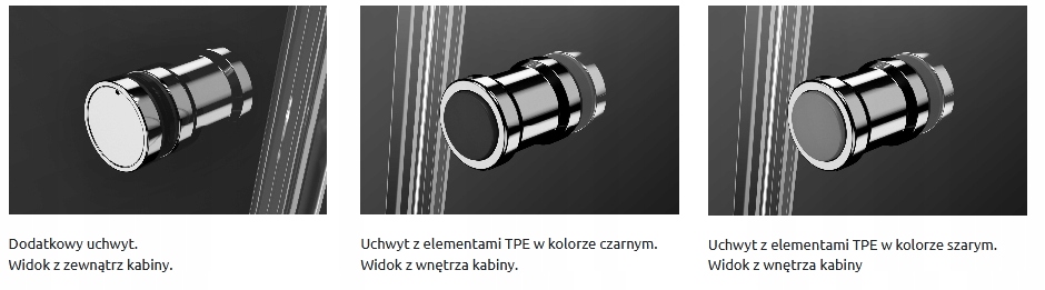- Дополнительная ручка: Для душевых кабин, дверей для ниш и шторок для ванн с двустворчатыми дверцами можно заказать дополнительную ручку. Подходит для моделей со стеклом толщиной 6 мм и 8 мм. Ручка собирается в процессе производства, поэтому ее необходимо заказывать одновременно с изделием.