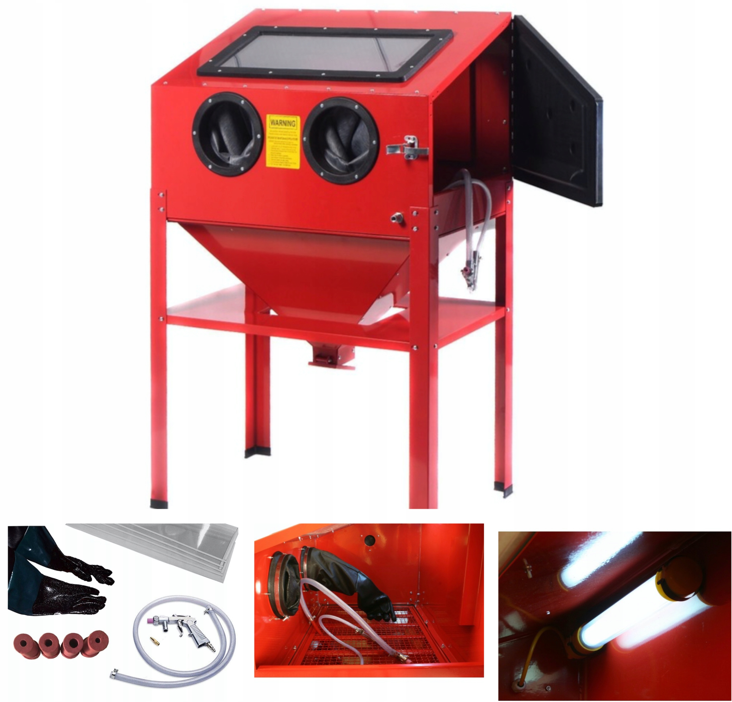 <ул>- Большая дверца, позволяющая разместить внутри большой пескоструйный элемент, например, диск автомобиля