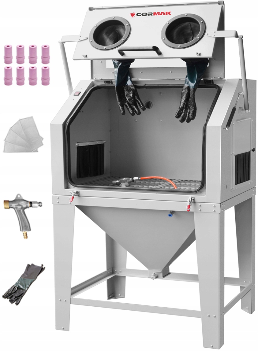 Пескоструйный аппарат полностью укомплектован, оснащен проверенной системой управления, прочной и большой кабиной с открывающимися вперед дверцами, пескоструйным пистолетом, восемью керамическими насадками. , качественные рабочие перчатки, освещение рабочей зоны, большое окно-видоискатель (без слепых зон), пылесборник и циклонный фильтр. Рекомендуемое устройство, помимо своей компактной конструкции и большого и вместительного рабочего пространства, обеспечивает удобство использования, надежность и безопасность работы.
