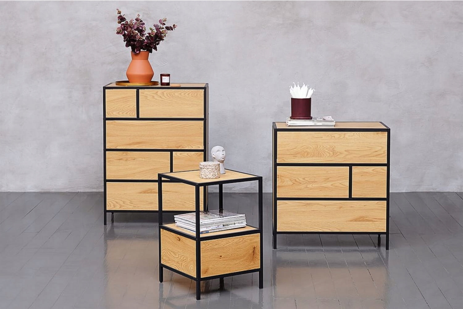 Шкаф GEO S – интересное предложение в индустриальном стиле, которое идеально впишется в современные тенденции стиля Лофт. Шкаф – практичное место для хранения безделушек и украшений. Мебель выглядит элегантно и легко, цвета и дизайн соответствуют современным мебельным тенденциям. Шкаф имеет декоративную металлическую конструкцию черного матового цвета. Полка, фасад и каркас изготовлены из ламинированного картона цвета дуба. Ящик открывается по системе «push to open» — чтобы открыть шкаф, достаточно слегка нажать на переднюю часть.