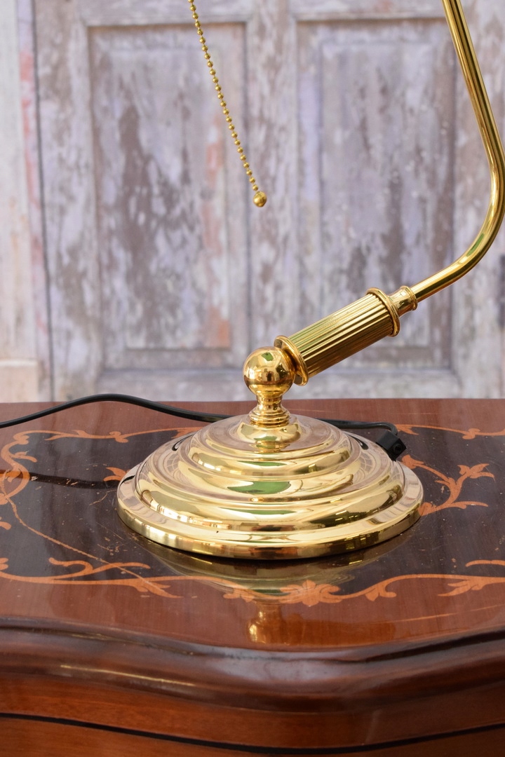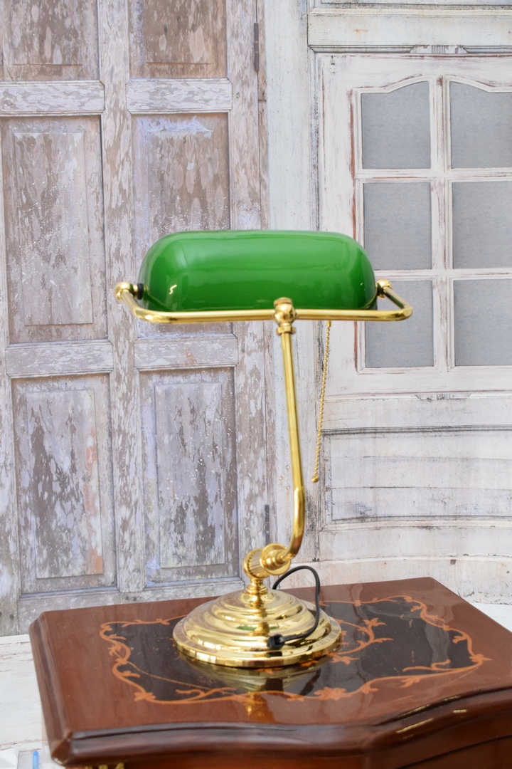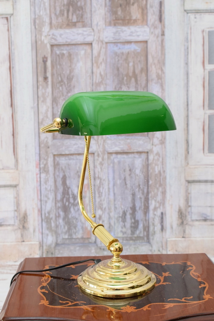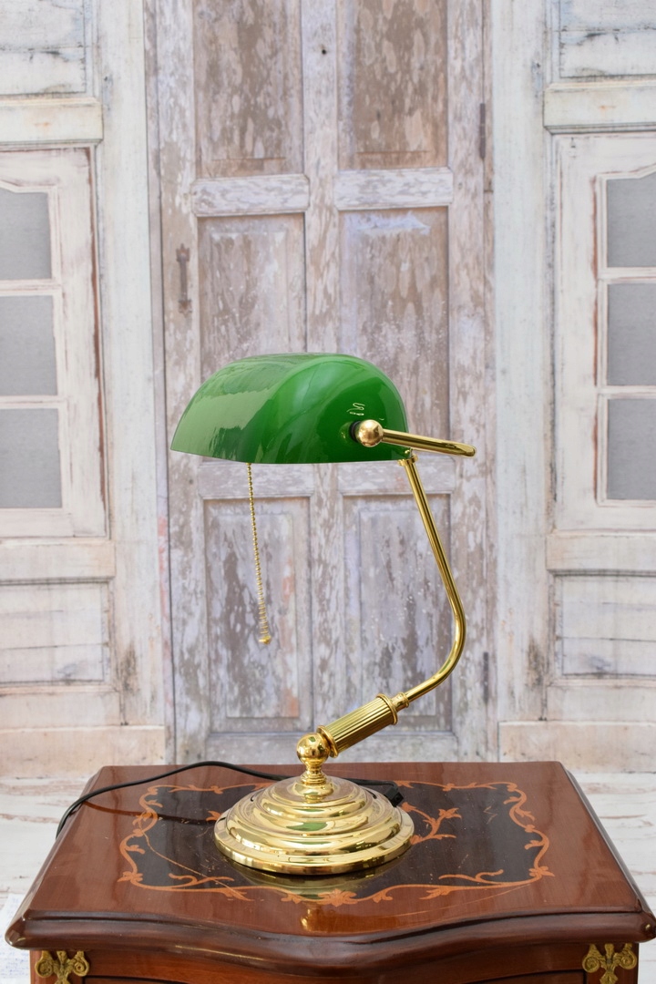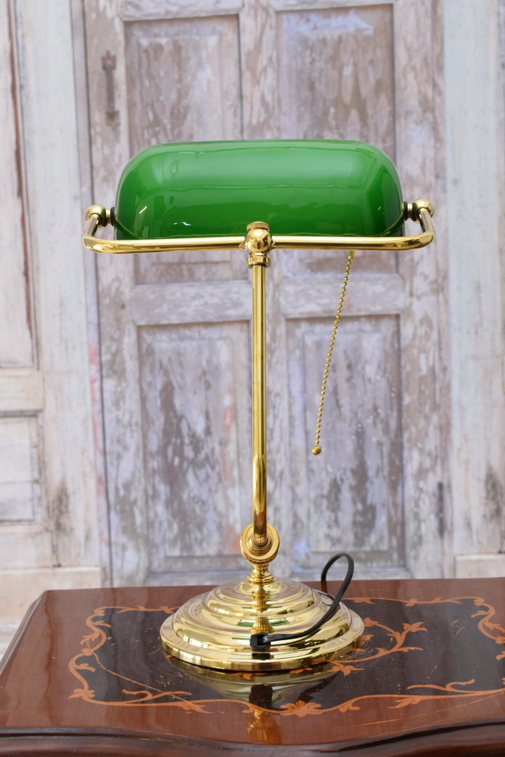 Классический латунный шкаф с продолговатым зеленым абажуром под названием нотариальное или банкир! Прямоугольная форма признака лампы популярного банкира. Эта чрезвычайно атмосферная и элегантная лампа также обеспечит очень функциональное и здоровое освещение. Для нотариуса или адвоката !!!!! 27 см