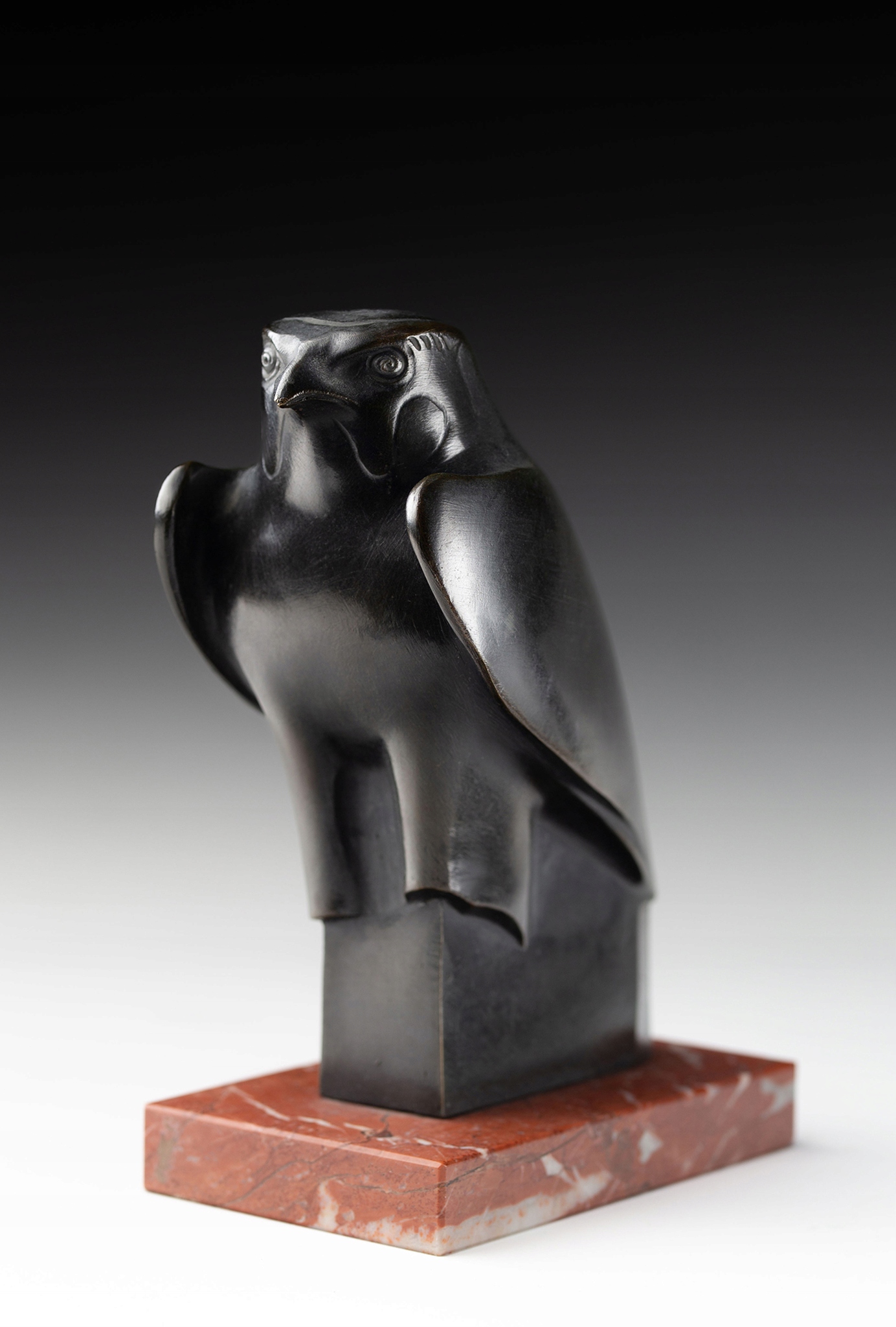 Декоративная геометрическая скульптура, изображающая сидящего сокола. Символ Гора представлен в профиль, с крыльями, расположенными вдоль тела, смотрящими вдаль. Птица изображена синтетически, с упрощенными формами. Ее силуэт плавно переходит в кубоид, который соединяется с мраморным основанием.