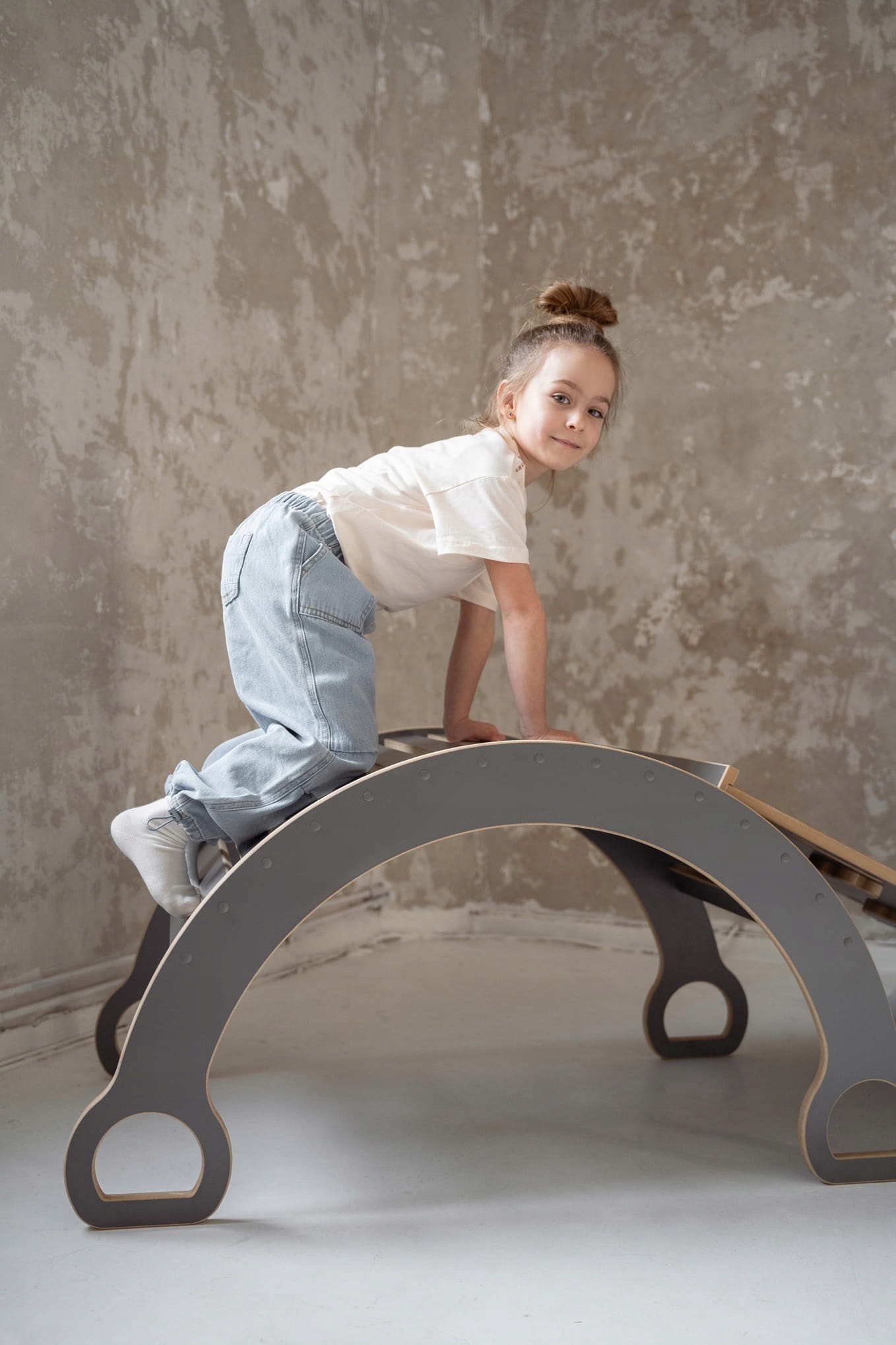 Качалка с горкой дома – ИДЕАЛЬНАЯ игровая площадка! С одной стороны тарелки находится скалодром, а с другой — суперскользкая горка. Вы также можете разместить горки на качалке и создать бревно - мы рекомендуем ходить босиком.