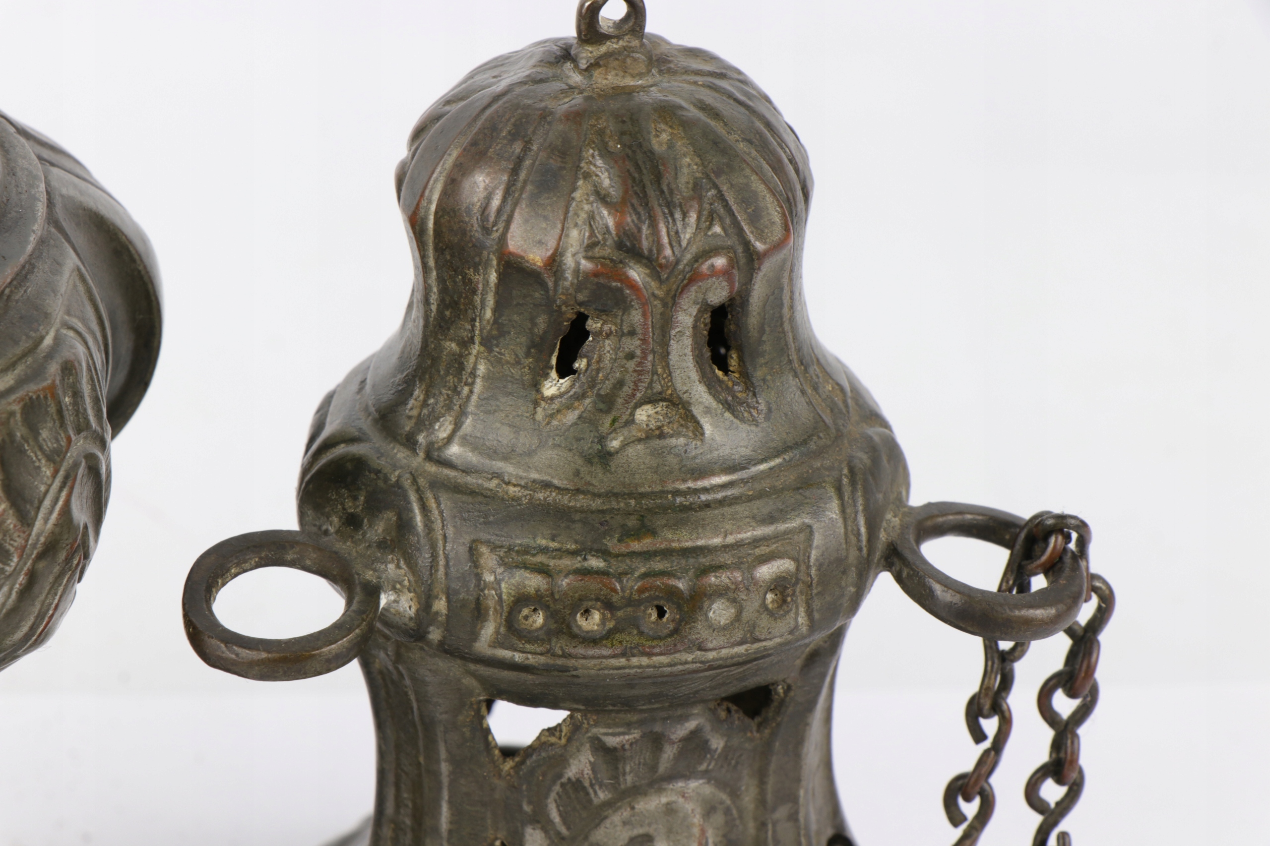 Как видно на фотографии. Следы использования, незначительные изгибы, недостающие фрагменты цепочки и верхней ручки кадила.